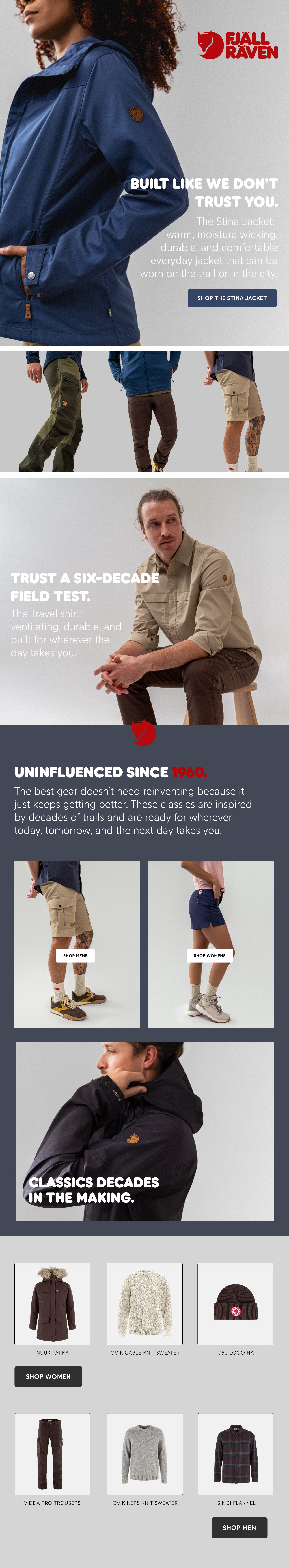A modern reintroduction of Fjällräven’s heritage pieces, designed to feel as relevant now as when they were first created. The campaign leans into clean, minimal visuals and elevated styling to reframe legacy products through a contemporary lens. By stripping things back, the focus stays on form, function, and longevity - highlighting pieces that were never designed to follow trends, but to outlast them.